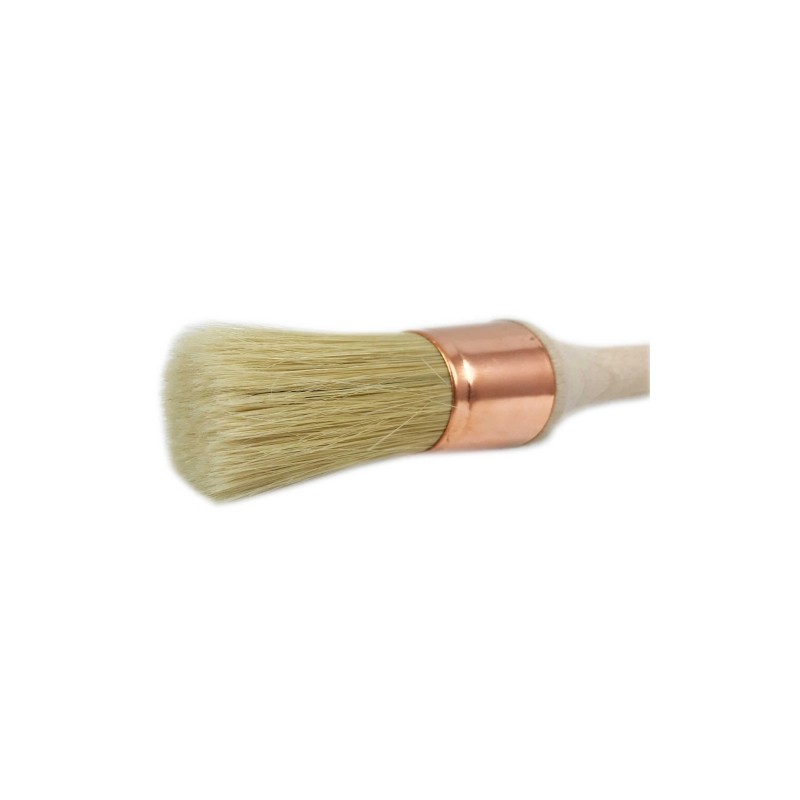 Brosse ronde en bois à poils souples mais élastiques pour un étalement confortable des produits de nettoyage sur différentes surfaces.